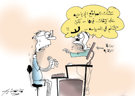 The Bahraini Ministry of Information’s Press, Publications, and Censorship Department emerges from a computer screen to admonish: Go to porn sites as much as you like, but politics? FORBIDDEN!