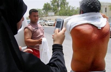 Laila Dashti, a member of the Bahrain Human Rights Center, uses her cell phone to take pictures of bruises on the back of another member of the group, Abbas Abdel-Aziz, on Sunday, June 19, 2005, outside a police station in Riffa, Bahrain. An unidentified man who also claims police beat him, is seen at center. The activists say they were beaten on coming to the police station to demand the release of about 50 unemployed Bahrainis who were arrested earlier Sunday at a demostration demanding jobs. (AP Photo/Hasan Jamali)