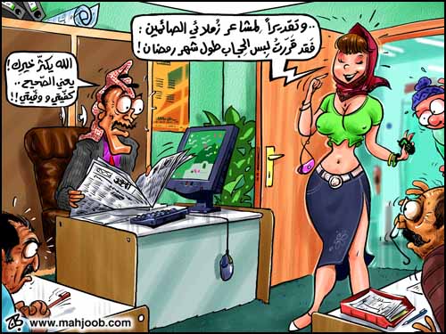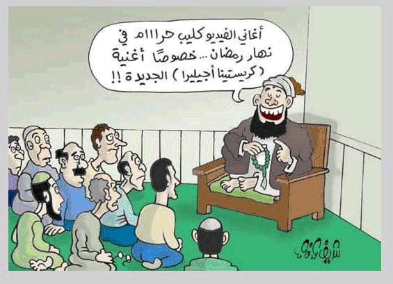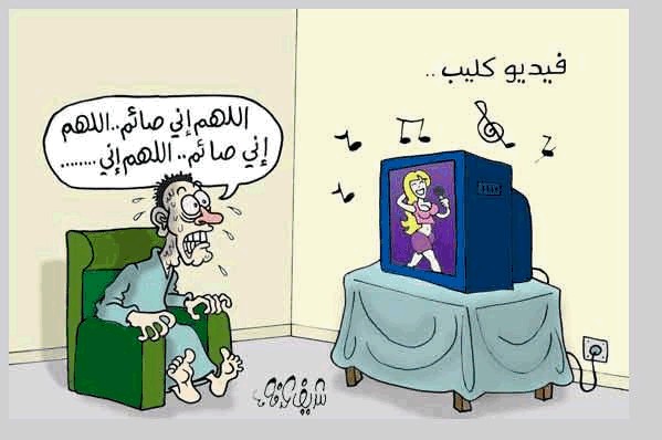 This cartoon is in the same stream of the first (and the one after actually) where a fasting man is sitting in front of a TV watching all the “loose” video clips and thinks that just uttering “I am fasting I am fasting” would be enough to save him.. he looks like he’s well on the way of losing it himself there doesn’t he?