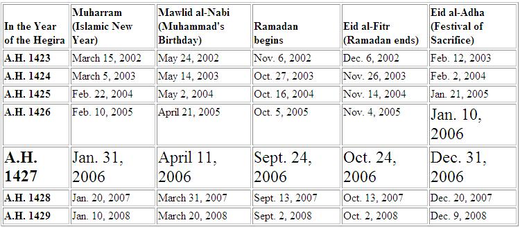NOTE: All holidays begin at sundown on the evening before the date given. The Islamic calendar is based on lunar observation; thus, the above dates may vary by one or two days.