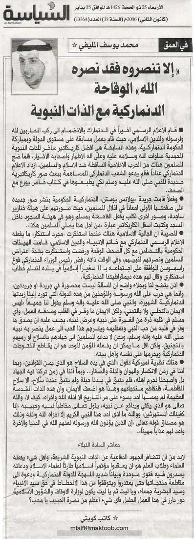 يوضؠلك ما الذيØÂصل لتكنعلى بينة(my translation: Respected brother, look at what those pigs did to our good religion and to our Prophet: they swore at him.. and this is a report which was published in the Kuwaiti Al-Siyasah newspaper by Mr. Mohammed Yousif Al-Mulaifi which shows you exactly what happened so that you are informed.)