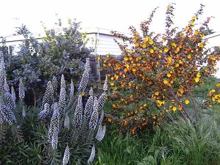 This year it would’ve had double the amount of inflorescences. The yellow flowered plant is a Fremontodendron. It is tilted because it had so many leaves that the wind pushed it over. I cut out most of its branches and pulled it back upright with a cloth brace and a fishing line tether. The plant in the back ground with blue flowers is a Ceanothus (it’s the size of a small tree now.)